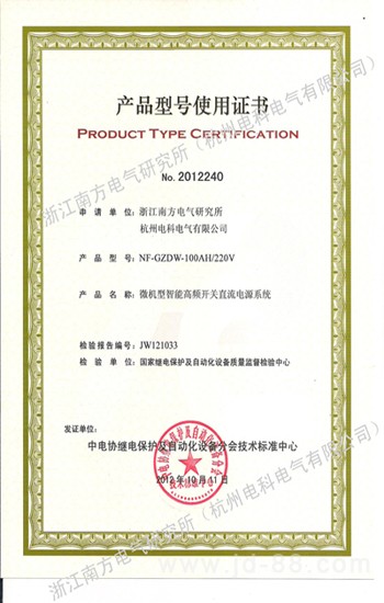 南方電科微機(jī)直流屏產(chǎn)品型號(hào)使用證書(shū)